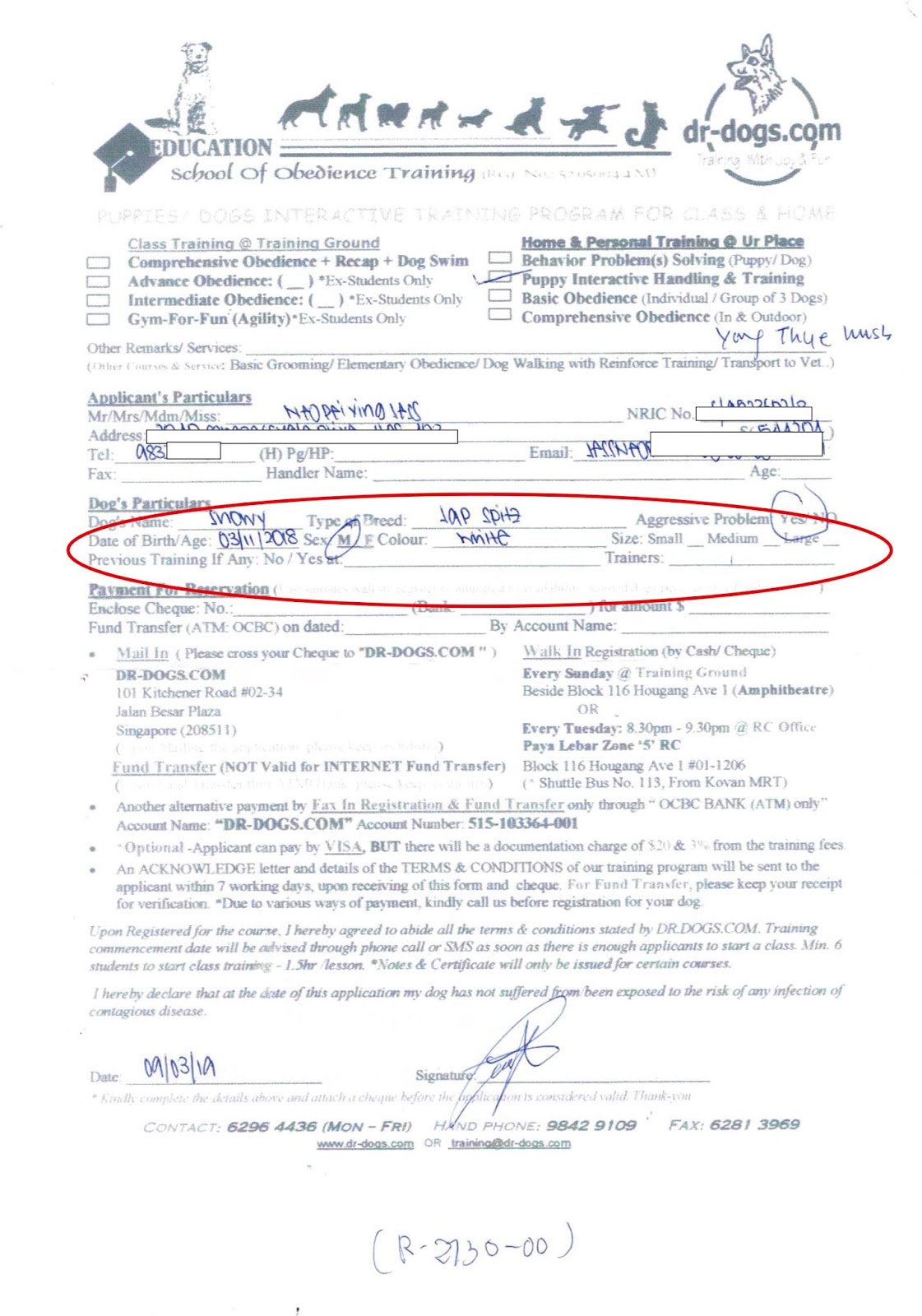 Only when Mr Ramesh Singh from Animal & Veterinary Service (AVS formally AVA) called, I started to look into the first day's training and as the incident only happened on second day's training. I found out the “slip collar” that the owner had been using all the time and she herself mentioned what she usually did to her BABY puppy “But 我照样的跟它打!” before the training started. Maybe is GOD helping Snowy again!